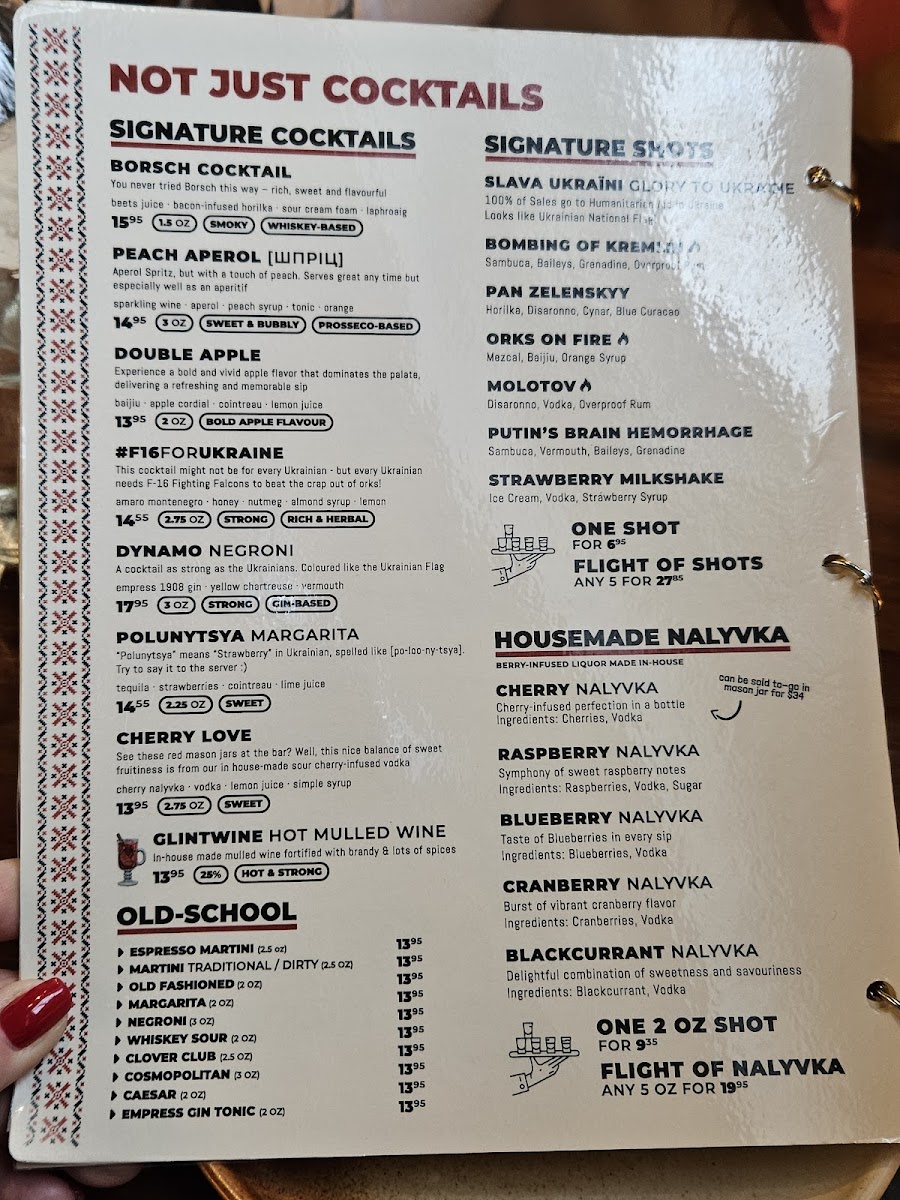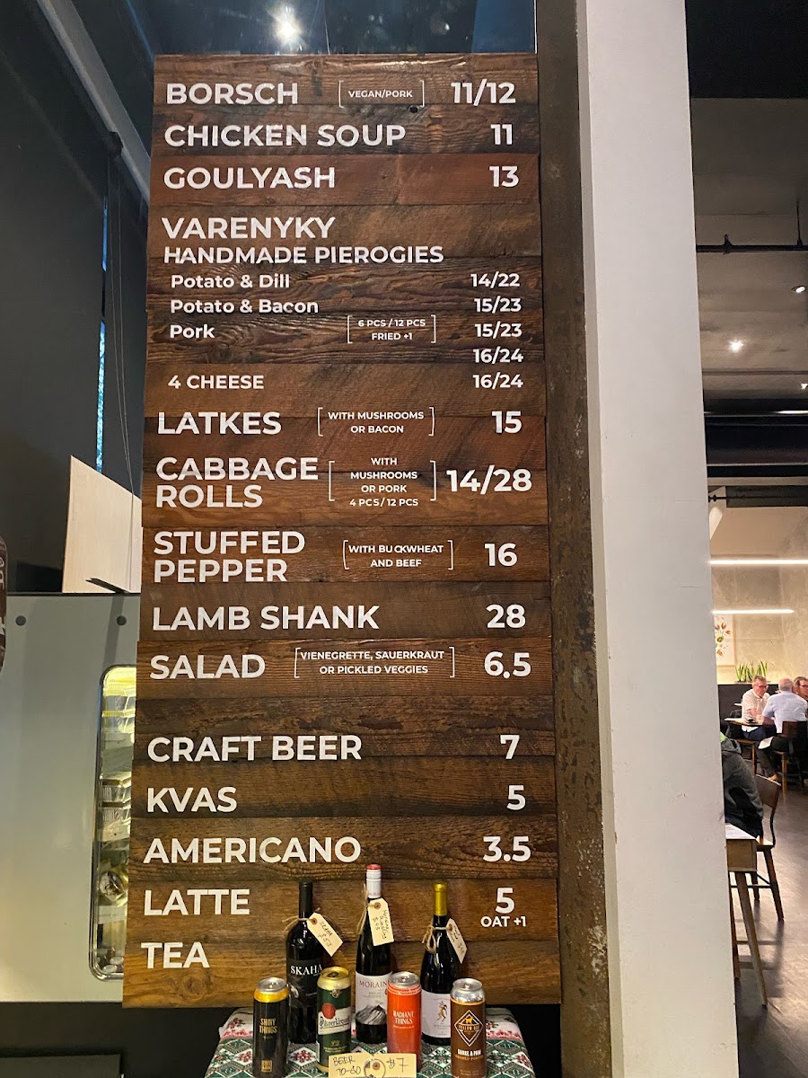 The menu is a tapestry of flavors, featuring favorites like Borsch, Varenyky, and Nalysnyky. Each dish, from the rich pork borsch to the comforting cabbage rolls, is crafted with care to provide a taste of home-cooked Ukrainian meals. Notable highlights include the wild boar pierogies and sumptuous beef sausage, showcasing the culinary skill and passion behind each plate.